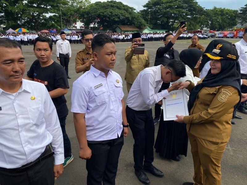 "Ini merupakan momen bersejarah dan patut disyukuri. Sekarang saudara sudah menjadi bagian dari ASN. Meski statusnya 'Paruh Waktu', harus tetap amanah dan bertanggung jawab melayani masyarakat," ujar Bunda Eva di hadapan ribuan pegawai.