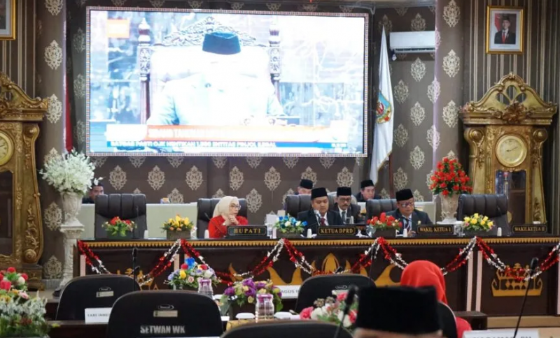 Way Kanan, Bupati Ayu Asalasiyah, S.Ked., menghadiri Paripurna Istimewa Agenda Mendengarkan Pidato Kenegaraan Presiden Republik Indonesia dalam rangka Hari Ulang Tahun Ke-80 Republik Indonesia Tahun 2025 di Ruang Buway Pemuka DPRD Kabupaten Way Kanan, Jum’at (15/08/2025) secara hybrid.