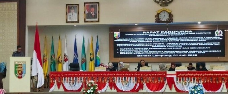 Penyampaian pandangan umum fraksi dilakukan dalam rapat paripurna di Gedung DPRD Provinsi Lampung, Selasa, (1/1/2025). Baca juga: Penanganan Pasca Tsunami, Pemkab Lamsel Hadiri Rakor di Kemenko PMK RI