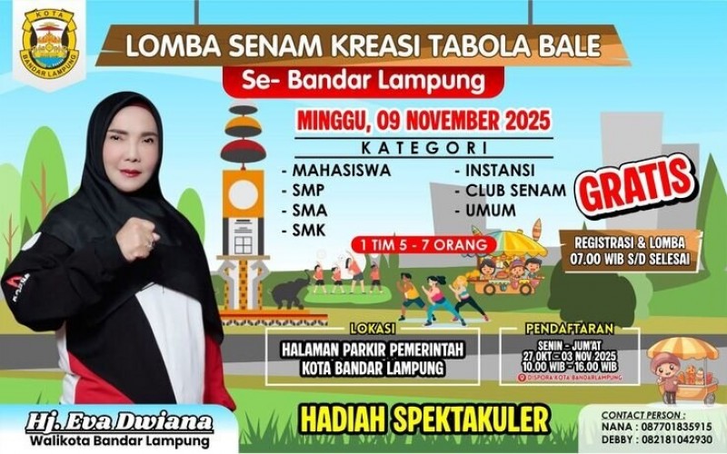 Selain lomba seru, kegiatan ini juga akan dimeriahkan dengan penampilan komunitas senam lokal dan beragam doorprize menarik. Bahkan, Wali Kota Bandarlampung Eva Dwiana dijadwalkan hadir langsung untuk membuka acara!