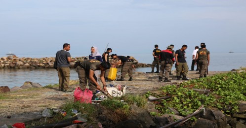 Kalianda, LE - Badan Penanggulangan Bencana Daerah (BNPB) Pemerintah Kabupaten Lampung Selatan menggelar aksi bersih pantai, di objek wisata kuliner Tempat Pelelangan Ikan (TPI) Dermaga Bom Kalianda, Jumat (26/4/2019).