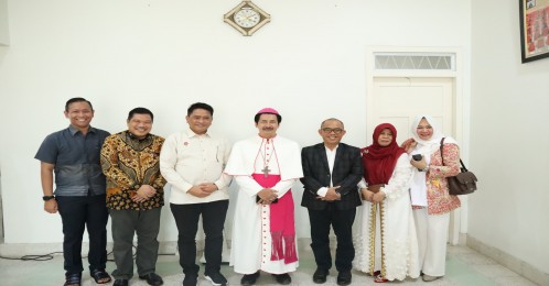 Bandarlampung, LE - Kepala Kantor Wilayah Kementerian Agama Provinsi Lampung, Puji Raharjo, mengunjungi Uskup Keuskupan Tanjung Karang, Mgr. Vinsensius Setiawan Triatmojo, di Kediamannya Pahoman Bandar Lampung di damping Ketua Dharma Wanita Kanwil Kemenag Ibu Mardhoti Puji, Kepala Bagian Tata Usaha Marwansyah, dan Ketua Tim Kerukunan Umat Beragama Alifah, Selasa, 25 Desember 2023.