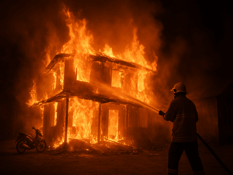Bandarlampung, LE — Suasana Minggu malam di Kelurahan Kangkung, Kecamatan Bumi Waras, mendadak mencekam. Api berkobar hebat melahap satu rumah semi permanen di Jalan Ikan Kiter sekitar pukul 19.00 WIB, menyebabkan seorang lansia bernama Suraji (65) tewas setelah diduga tersengat listrik saat memperbaiki becak motornya (bentor).