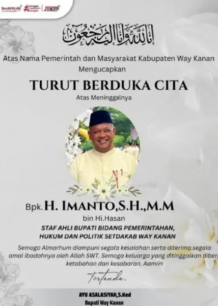 “Inalilahi Wa Inailahi Rojiun, telah meninggal dunia Saudara kita Bapak Hi. Imanto ( STAFF AHLI BUPATI KABUPATEN WAY KANAN).