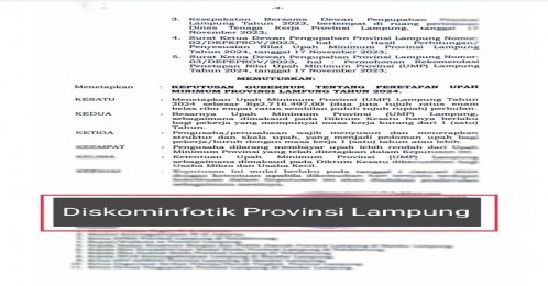 Bandarlampung, LE - Pemerintah Provinsi Lampung menerbitkan Surat Keputusan Gubernur Lampung Nomor: G/694/V.08/HK/2023, yang menetapkan Upah Minimum Provinsi Lampung Tahun 2024.