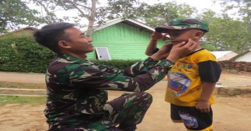 Usai perpamitan dengan warga, Serda Romi menghampiri Aji Pramana (bocah 7 Tahun) seraya menggendongnya sebagai bentuk kasih sayang kepada anak.