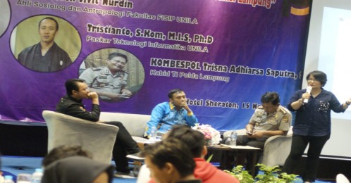 "Ada tiga pembicara dan pakar IT yang kami undang dalam acara ini. Yaitu Ahli Sosiologi dan Antropologi Fakultas FISIP Unila, Bartoven Vivit Nurdin, kemudian Pakar Teknologi Informatika Unila, Tristianto dan Kabid TI Polda Lampung Kombes Pol Trisnadi," ujarnya. Baca juga: Pengurus KONI Lampung Dilantik dan Dikukuhkan