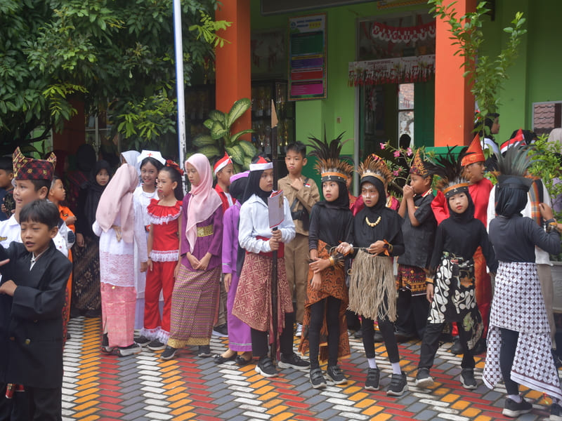 Sebanyak 408 siswa dari kelas 1 hingga kelas 6 ikut ambil bagian dalam kegiatan tersebut. Meski cuaca tampak mendung, tak satu pun surut semangat anak-anak berparade di rute seputaran sekolah — mulai dari Jalan Sekolah, Jalan Raya, hingga Jalan Keramat — sambil menampilkan berbagai kostum inspiratif, dari pahlawan kemerdekaan hingga tokoh nasional yang berjasa bagi bangsa.