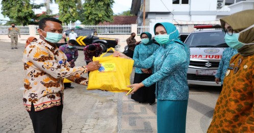 Bandarlampung, LE- Ketua Tim Penggerak PKK Provinsi Lampung Ibu Riana Sari Arinal menyerahkan bantuan tahap awal kepada petugas di