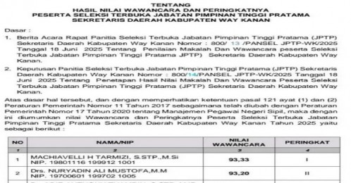“Proses penilaian makalah dan wawancara telah dilaksanakan secara objektif untuk menggali visi, misi, kompetensi, dan integritas para calon dalam memimpin birokrasi di Way Kanan ke depan,” bunyi salah satu poin dalam rilis resmi tersebut.