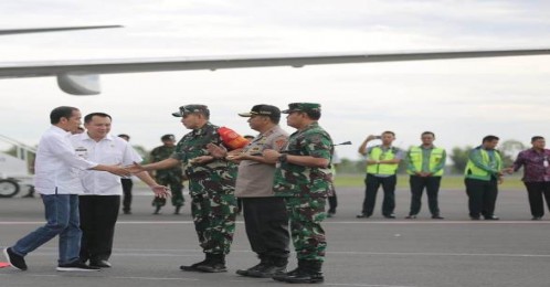 Natar, LE - Gubernur Lampung Muhammad Ridho Ficardo dan Pangdam II Sriwijaya Mayjen TNI Irwan, S.I.P., M.Hum serta Kapolda Lampung Irjen Pol Purwadi Arianto dan jajaran Fokorpimda Provinsi Lampung menyambut hangat kedatangan Presiden Republik Indonesia Joko Widodo di Bandara Internasional Raden Inten II Lampung Selatan, Rabu (2/1/19).